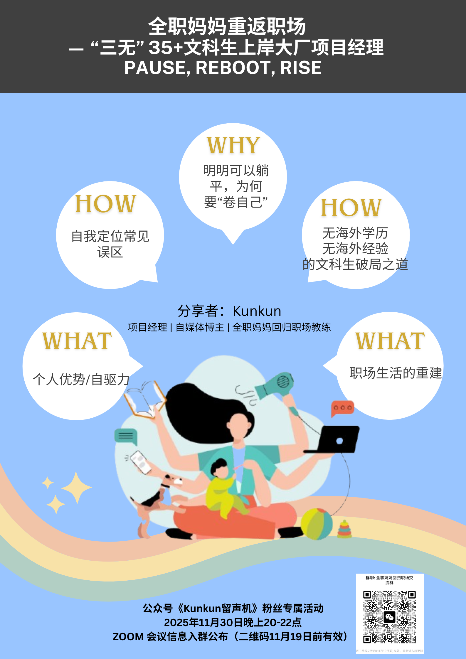 所以我想做的是帮助全职妈妈回归职场,陪伴她们成长的的职场教练。